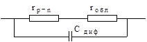 Рис. 1.3. Эквивалентные схемы перехода на низких частотах : а - для диффузионной емкости (Сдиф ) ; б - для барьерной емкости (Сбар ). Сопротивление емкости в общем случае где rp-n - сопротивление прямосмещенного p-n-перехода; rобр - сопротивление обратносмещенного p-n-перехода (rобл < rпр << rобр ); rобл - суммарное сопротивление n- и p-областей и контактов этих областей с выводами.