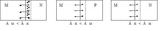 Рис. 1.5. Диод в импульсном режиме: а - схема простейшего ключа; б - временные диаграммы входного напряжения и тока через диод 1.3. Переход металл - полупроводник Эффект, полученный на основе такого контакта получил название эффекта Шоттки. Сущность эффекта заключается в следующем. Процессы в переходе металл-полупроводник находятся в прямой зависимости от работы выхода электронов. Под работой выхода электрона подразумевается та минимальная энергия, которую надо сообщить электрону, чтобы он мог выйти из металла или из полупроводника. На рис. 1.6 приведены структуры переходов металл-полупроводник с разной работой выхода электронов: Ам - работа выхода электронов из металла; АП - работа выхода электронов из полупроводника. На рис. 1.6 (при Ам < АП ) переход металл-полупроводник не обладает выпрямляющими свойствами, так как при таких условиях будет преобладать выход электронов из металла и при любой полярности напряжения на переходе сопротивление слоя полупроводника будет малым, поскольку этот слой обогащен основными носителями. Такой контакт (невыпрямляющий) используется во всех полупроводниковых приборах в месте соединения области с внешним выводом и его называют омическим. На рис.1.6 (при АП < Ам ) переход также не обладает выпрямляющими свойствами, так как из полупроводника в металл выходит гораздо большее количество электронов, чем в обратном направлении, и в приграничном слое образуется область, обогащенная основными носителями-дырками.