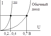 Рис. 1.7. ВАХ диода Шоттки (ДШ) и обычного диода 4. Отсутствие диффузионной емкости существенно повышает быстродействие приборов, поэтому диоды, выполненные на основе такого контакта, обладают значительно лучшими переключающими свойствами, чем диоды на основе контакта полупроводник -полупроводник. Обладая высоким быстродействием, диоды Шоттки широко используются в цифровой технике (например, логика ТТЛШ). Пример.