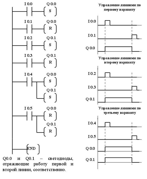 I 0.0 – кнопка включения двигателя по часовой стрелке; I 0.1 – кнопка включения двигателя против часовой стрелке; I 0.2 – кнопка выключения двигателя; Q 0.0 – светодиод, имитирующий работу двигателя по часовой стрелке; Q 0.1 – светодиод, имитирующий работу двигателя против часовой стрелке. Вариант б): Напишите УП в которой, реверс двигателя через кнопку `Стоп` был бы возможен только с истечением трехсекундной выдержки, а перезапуск в том же направлении осуществлялся без задержки после остановки кнопкой `Стоп`.