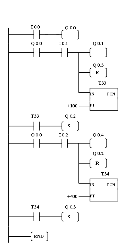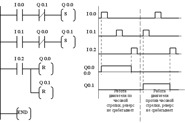 I 0.0 – кнопка включения двигателя по часовой стрелке; I 0.1 – кнопка включения двигателя против часовой стрелке; I 0.2 – кнопка выключения двигателя; Q 0.0 – светодиод, имитирующий работу двигателя по часовой стрелке; Q 0.1 – светодиод, имитирующий работу двигателя против часовой стрелке; Q 0.5 – светодиод, говорящий что до нажатия кнопки стоп двигатель вращался по часовой стрелке; Q 0.6 – светодиод, говорящий что до нажатия кнопки стоп двигатель вращался против часовой стрелки; T33 – таймер, осуществляющий задержку реверсирования двигателя. Диаграмма работы двигателя при реверсировании