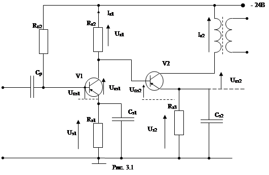 2.2 Выбор транзисторов и расчет режима работы.Расчет усилителя принято вести, начиная с выходного каскада. Он выполняется по однотактной трансформаторной схеме (рис. 2.3), которой транзистор включается по схеме с общим эмиттером, имеющей наибольшей коэффициент усиления мощности, и работает в режиме «А». Транзистор выходного каскада выбирается по двум основным условиям: Рк