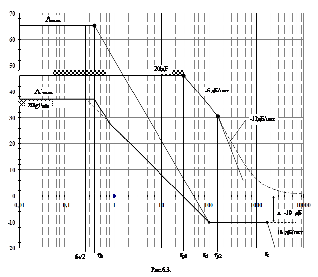 8. Вычерчиваем постоянное значение уровня Амах до частоты fВ линия Амах соединяется с линией оптимального наклона в диапазоне частот fВ … 2 fВ плавной как пказано на рис.6.1.