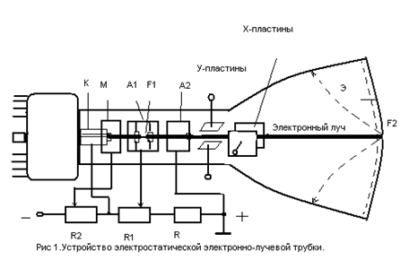 Осциллографическая электронно-лучевая трубка представляет собой стеклянный баллон специальной формы, в котором создан высокий вакуум. В ней расположены электроды, осуществляющие формирование электронного потока в виде тонкого электронного луча. И электроды, управляющие этим лучом. Совокупность электродов, формирующих электронный луч, называется электронным прожектором