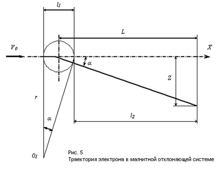 Под действием силы Если поле линзы слабо, то, конечно, может оказаться, что лучи и после выхода из линзы останутся расходящимися – в этом случае ось пересекут продолжения лучей. С другой стороны, при сильном поле электрон внутри линзы успеет несколько раз пересечь ось. 2.4 Управление пространственным положением луча осуществляется с помощью электрических (электростатическая отклоняющая система) и магнитных (магнитная отклоняющая система) полей, а управление плотностью тока – с помощью электрических полей. Электронно-лучевые приборы используются для получения видимого изображения электрических сигналов, а также для запоминания (хранения) сигналов. Отклоняющая система служит для управления положением луча в пространстве. В трубках с магнитным управлением отклоняющая система состоит из двух пар отклоняющих катушек. Магнитная отклоняющая система обычно содержит две пары катушек, надеваемых на горловину трубки и образующих магнитные поля во взаимно перпендикулярных направлениях. Рассмотрим отклонение электрона магнитным полем одной пары катушек, считая, что поле ограничено диаметром катушки и в этом пространстве однородно. На рис.1 силовые линии магнитного поля изображены уходящими от зрителя перпендикулярно плоскости чертежа. Электрон с начальной скоростью V0 движется в магнитном поле, вектор индукции B которого нормален к вектору скорости V0 , по окружности с радиусом По выходе из магнитного поля электрон продолжает движение по касательной к его криволинейной траектории в точке выхода из поля. Он отклонится от оси трубки на некоторую величину z = L tg a . При малых углах a » tg a ; z » L a .