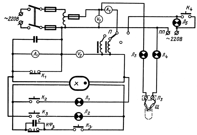 Осмотром и проверкой светильников должны устанавливаться: наличие, целостность и надежность закрепления рассеивателей, защитных стекол, экранирующих решеток, отражателей, надежность электрических контактов, состояние изоляции зарядных проводов, должны устанавливаться и устраняться возникающие неисправности в светильниках с люминесцентными лампами, причиной которых могут быть лампы, стартеры, ПРА, ошибки в схеме и др. В установках с большим количеством люминесцентных светильников проверку их для обнаружения причин повреждения желательно производить на стенде в ремонтном отделении мастерской. На стенде должны проверятся лампы и детали светильников, снятые с эксплуатации, и новые перед установкой. Схема такого стенда показана на рис. 10.