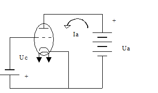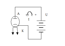 Рис. 1. Включение и характеристика диода При напряжении источника питания, равно нулю (если вывод анод и катод замкнуты внешним проводником), в цепи протекает ток, называемый начальным. Он вызван электронами, начальная скорость которых при вылете из катода достаточно велика. Только при отрицательном напряжении на аноде порядка 0,5В анодный ток полностью прекращается, а при дальнейшем увеличении отрицательного напряжения обратный ток отсутствует. Вакуумные диоды имеют сравнительно ограниченное применение. Значительно шире область применения трехэлектродных ламп – триодов. Триод отличается от диода наличием третьего электрода – управляющей сетки, которая выполнена в виде проволочной спирали, размещенной в пространстве между катодом и анодом. Если напряжение на сетке относительно катода отрицательное, она будет тормозить движение электронов от катода к аноду, что приведет к уменьшению анодного тока. При достаточно большем минусе на сетке анодный ток может вообще прекратиться. Если же потенциал сетки относительно катода положителен, сетка будет способствовать увеличению анодного тока. При этом часть электронов будет оседать на сетке, образую сеточный ток, хотя режим использования электронных ламп с сеточным током применяется редко. Таким образом, изменяя потенциал сетки относительно катод, можно управлять анодным током триода, что и послужило причиной названия сетки управляющей.