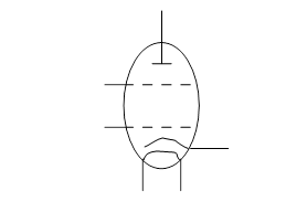 Рис. 3. Четырехэлектронная лампа – тетрод. Основной недостаток тетрода – динатронный эффект – состоит в следующем. Электроны на пути от катода к аноду разгоняются до большой скорости. При напряжение на аноде 100 В эта скорость достигает 6000 км/с – в 10000 раз больше скорости пули при вылете из дула винтовки. Ударяясь о поверхность анода, электроны выбивают из него другие, вторичные электроны. Такое явление называется вторичной электронной эмиссией. Если напряжение на экранной сетке больше сетке на аноде, вторичные электроны с анода направляются на экранную сетку. В результате анодный ток уменьшается, а на анодной характеристике тетрода появляется провал. Для борьбы с динатронным эффектом в конструкцию тетродов вводят специальные лучеобразующие пластины, которые концентрируют электронный поток на небольшой части поверхности анода, где создается пространственный заряд, препятствующий обратному потоку вторичных электронов на экранную сетку. Такие тетроды называются лучевыми. Другой способ борьбы с динатронным эффектом состоит в установке еще одной сетки между экранной сеткой и анодом. Она носит название защитной или антидинотродной сетки и соединяется с катодом внутри или снаружи лампы, для чего имеется отельный вывод. Такие пятиэлектродные лампы называются пентодами. Антидинатронная сетка выполняется редкой, на поток быстрых первичных электронов влияния не оказывает, медленные же вторичные электроны отталкиваются ею обратно на анод. К многоэлектронным электронным лампам относятся лампы, имеющие более трех сеток, например, гептоды, у которых пять сеток. Гептоды предназначены для преобразования частоты сигнала и содержит две раздельные управляющие сетки. Очередность расположения сеток при счете от катода следующая: первая сетка является первой управляющей, вторая сетка – экранная, далее следует вторая управляющая сетка, за ней еще одна экранная и, наконец, антидинатронная сетка. Экранные сетки обычно соединены внутри ламп между собой и имеют общий вывод. Вольт – амперные характеристики гептодов такие же, как у пентодов, а наличие экранной сетки между управляющими снижает паразитную емкость между ними. Иногда используется устаревшее название гентода – пентагрид, что в переводе обозначает пять сеток. Электронно-лучевой трубкой называется электровакуумный прибор, предназначенный для преобразования электрических сигналов в видимое изображение, или наоборот. Существуют несколько разновидностей электронно-лучевых трубок по их названию: осциллографические, приемные телевизионные, телевизионные передающие и специальные. Осциллографические трубки относятся к трубкам с электростатическими отклонениями луча. Условное графическое обозначение осциллографической трубки приведено на рис. 4.