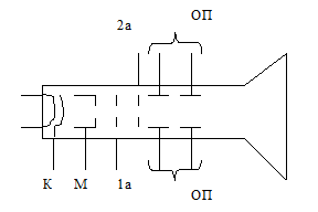 Рис. 4. Обозначение осциллографической электронно-лучевой трубки Рассмотрим ее устройство. Катод К представляет собой, как обычно, полый цилиндр, но с одним донышком. Оксидный слой нанесен только на это донышко, которым катод обращен внутри трубки. Далее установлен управляющий электрод или модулятор М, который выполнен в виде цилиндра с донышком, в котором имеется отверстие. На модулятор подается отрицательное напряжение относительно катода, которым отталкиваются к оси трубки электроны, вылетающие из катода под углом. Через отверстие в донышке модулятора походят лишь те электроны, которые находятся на оси. Модулятор также выполняет функции управляющей сетки: с увеличением отрицательного напряжения интенсивность выходящего из отверстия электронного потока уменьшается и при определенном отрицательном напряжении полностью прекращаются. Такое напряжение называется запирающим. За модулятором установлен первый анод 1а, который подается относительно катода положительное напряжение. Конфигурация электрического поля в пространстве между модулятором и первым анодом имеет форму линзы. Этим полем осуществляется фокусировка электронного пучка, благодаря которой он приобретает форму спицы. Первый анод выполнен в виде полого цилиндра модулятора диаметром больше, чем диаметр цилиндра модулятора. Изменяя напряжение на первом аноде, можно осуществлять фокусировку электронного пучка. Далее следует второй анод 2а, который является ускоряющим электродом. Он также выполнен в виде полого цилиндра. Основная часть электронов в пучке, разогнавшись до большой скорости, не попадает на стенки второго анода, а пролетает по его оси. На второй анод подается высокое напряжение, необходимое для придания электронам в пучке большой скорости. Комплект перечисленных электродов трубки (катод с подогревателем, модулятор, первый и второй аноды) образует электронный прожектор или электронную пушку и выполняется в виде жесткого единого узла, собранного на слюдяных пластиках, с использованием керамических цилиндрических изоляторов. Далее на пути электронного пучка установлены две пары отклоняющих пластин ОП. Средний потенциал отклоняющихся пластин равен потенциалу второго анода и не должен воздействовать на электронный пучок. Но если между пластинами пары имеется напряжение, пучок отклоняется от оси трубки в сторону более положительной пластины. Одна пара пластин расположена вертикально, может отклонять электронный пучок в горизонтальном направлении и называется горизонтально – отклоняющей. Вторая пара пластин расположена горизонтально и называется вертикально – отклоняющей. Пройдя мимо системы отклоняющих пластин, электронный луч попадает на экран Э, покрытый слоем специального вещества, которое называется люминофором. Под воздействием электронной бомбардировки происходит свечение люминофора, наблюдаемое с внешней стороны экрана. В связи с тем, что бомбардировка люминофора, покрытого тонким слоем металла, сопровождается вторичной электронной эмиссией, коническая часть колбы трубки покрыта графитовым слоем (аквадагом) и соединяется со вторым анодом. Вторичные электроны удавливаются аквадагом и образуют ток второго анода. К приемным электронно-лучевым трубкам относится черно- белые и цветные кинескопы. Устройство черно-бел