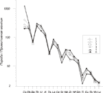 Примечания. Прочерк - оксид не определялся. Места отбора образцов: 25, 26 - Уллукам, риодациты; 20 - Бийтиктебе, риодациты; 27 - Уллукам, дациты; 43, 32, 45, 48 - Бийтиктебе, дациты; 22, 23 - Уллукам, дациты; 6, 7 - Гарабаши, дациты; 396 - Малкинский поток, дациты; 338 - Западная вершина, дациты; 10 - Скалы Пастухова, дациты; 9 - основание Восточной вершины, дациты; 340 - Восточная вершина, дациты. Таблица 2 Малые элементы в вулканитах Эльбруса (г/т)