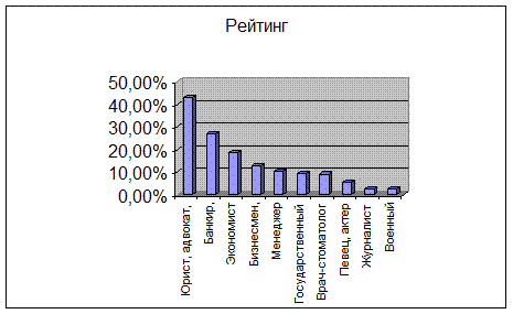 Табл.15 Как видно из данной диаграммы, первые 5 мест занимают профессии сферы коммерции и бизнеса, если не считать, конечно, юриста. Но в предыдущих опросах, которые были показаны в прошлых частях, данные профессии не доминировали так сильно. Это объясняется тем, что получить образование для престижной профессии, а тем более получить престижную работу, в нынешней России очень не просто. Во-первых, из-за дороговизны обучения в ВУЗах, даже государственных. Во-вторых, из-за отсутствия цивилизованного рынка труда, прежде всего для молодых специалистов. В-третьих это нестабильная экономическая ситуация в стране, которая не способствует нормальному развитию частного сектора экономики. И, наконец, в-четвертых, высокая криминализованность экономики. Важно заметить, что, при ответе на вопрос о самых прибыльных профессиях, профессия юриста резко сдает свои позиции, остальные параметры остаются примерно на тех же местах, что в опросе по престижности. Но теперь появляется профессия сферы криминала и проституции, которая по доходности, в понимании молодежи, перекрывает даже профессию врача-стоматолога, актера или певца, милиционера и военного. Заключение: Характеристика профессиональных ориентиров молодежи. Проблемы самоопределения и самоутверждения. Обобщая, можно сказать, что молодежь считает наиболее престижными те профессии, которые обладают особой значимостью в условиях перехода к рыночной экономике. Как в 60-70ые годы наиболее престижными были профессии (от физика-ядерщика до космонавта), отражавшие приоритеты поддержания статуса СССР как великой державы и сохранения его позиций в гонке вооружений, так и сейчас молодежь в своих приоритетах вполне адекватно отражает запросы российского общества, только сами эти запросы изменились. Не случайно на первом месте среди всех вариантов ответа на вопрос о том, что помогает получить хорошую работу, молодежь поставила «наличие высокой квалификации, знаний», что никак не может свидетельствовать о падении престижности знаний и квалификации. Хотелось бы также сказать, что выбор молодежью социально значимых профессий независимо от их популярности и оплачиваемости, говорит об серьезном осознании молодежью своей социальной роли, своих обязанностей. Морально-нравственные устои молодежи поколеблены не так серьезно, как об этом говорится и пишется. Мир ценностей нынешней молодежи соответствует миру ценностей нормального общества, хотя и здесь есть много проблем. Сейчас наше общество переживает эпоху перемен, смену идеологии и мировоззрения, реформирования всех сфер общественной жизни. Этот процесс происходит довольно медленно и главное болезненно. Экономический кризис, кризис культуры и идеологии, появление псевдокультур, стремительное проникновение в российское общество навязанных западных ценностей, дегуманизация личности породил в российском обществе, особенно в молодежном, такую группу людей, которым чужды общечеловеческие ценности, они не гнушаются нарушать закон, спокойно поступаются принципами и моралью ради достижения личной выгоды. Что больше всего настораживает, так это вялая реакция общества на это явление, оно как бы соглашается с существованием такого слоя общества и невольно интегрируется в него. Ярчайшим примером этому служит проникновение «зонной», «преступн
