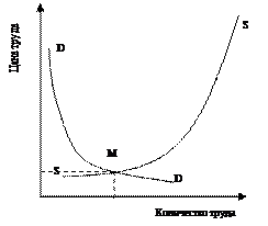 Рис.3. Цена, которую работодатель готов заплатить за использование труда, рассматривается в рыночной экономике как заработная плата. Она выступает в различных формах непосредственно денежных или натуральных расчетов нанимателя с работниками (повременной, сдельной или аккордной оплаты, премий, гонораров, комиссионных и т. д., которые иногда выдаются в виде части произведенных товаров), а также включает расходы предпринимателя на обучение и переподготовку персонала, обеспечение безопасности и безвредных условий труда, поддержание здоровья работников, на заботу о досуге и отдыхе работников, образовании их детей и т. п. Заработная плата тем выше, чем значительнее спрос на труд, а этот спрос возрастает при повышении производительности труда, что зависит не только от усилий самих работников, но и от количества и качества материально-технических ресурсов, которыми их наделяет работодатель, от того, как он организует их труд, т. е. от его собственных управленческих трудовых усилий. Поэтому личный доход предпринимателя от таких усилий, в экономической теории обычно рассматриваемый как часть прибыли предприятия, по сути также является заработной платой. Это нередко соответственно оформляется в малом бизнесе, где явственно видно, что в деятельности предпринимателя руководящие функции органично сочетаются и переплетаются с исполнительскими: здесь предпринимателю по согласованию с наемными работниками устанавливается определенная заработная плата. Спрос на труд, как и на любой товар, зависит от общей экономической конъюнктуры. Если она благоприятна, то предприниматель стремится, опережая конкурентов, расширить производство, прежде всего за счет трудовых усилий работников сверх «нормальных», оговоренных в соглашении о найме (путем повышения интенсивности труда либо увеличения продолжительности рабочего дня). В таком случае работники получают возможность давить на предпринимателя и добиваться за счет его сверхприбыли повышенных заработков, компенсирующих им упущенную выгоду свободного времени, сохранения сил и здоровья и т. п. С ростом заработной платы цена отдыха, вследствие того, что работники жертвуют им, повышается. Существует и естественный предел уступок со стороны работника, что связано с физической необходимостью регулярно восстанавливать способность к труду. Рано или поздно наступает такой момент, когда увеличение заработной платы влечет за собой на каком-то отрезке стабилизацию, а затем и снижение интенсивности труда и сокращение рабочего времени. Различают номинальную и реальную заработную плату. Первая, строго говоря, — это представленная в денежной форме сумма всего того, что работник получает за свой труд от работодателя (включая непосредственно денежные, а также натуральные выплаты и прочие вложения предпринимателя в работника в оценке по рыночной стоимости их самих или заменителей). Реальная заработная плата — это совокупность товаров и услуг, которые можно приобрести на соответствующую сумму с учетом покупательной способности денег. Упомянутые выше натуральные выплаты и прочие вложения работодателя в работника чаще всего для простоты не учитываются в составе его номинальной зарплаты, а принимаются во внимание при подсчете реальной. Теоретически доказано, что условием максимизации прибыли я