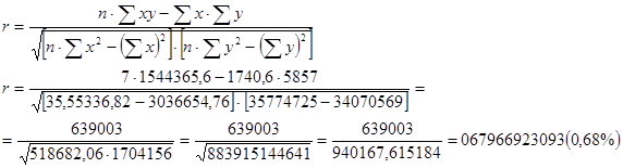 a0 = 833,857142857 – 248,942857142a1 833,857142857 – 248,942857142a1 + 291,464053712a1 = 886<242166877 42,52119657a1 = 52,385024202 a1 = 1,23197436209 (1,23) a0 = 833,857142857 – 248,942857142 * 1,23197436209 = 527,165925233 (527,17) y = 527,17 + 1,23x y1 = 527,17 + 1,23 * 284,6 = 877,228 y2 = 527,17 + 1,23 * 160,1 = 724,093 y3 = 527,17 + 1,23 * 351,1 = 959,0,23 y4 = 527,17 + 1,23 * 247,6 = 831,718 y5 = 527,17 + 1,23 * 282,2 = 874,276 y6 = 527,17 + 1,23 * 366,8 = 978,334 y7 = 527,17 + 1,23 * 50,2 = 588,916 Коэффициент корреляции: