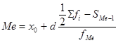 Мода применяется для решения некоторых практических задач. Так, например, при изучении товарооборота рынка берется модальная цена, для изучения спроса на обувь, одежду используют модальные размеры обуви и одежды и др. Медиана - это численное значение признака у той единицы совокупности, которая находится в середине ранжированного ряда (построенного в порядке возрастания, либо убывания значения изучаемого признака). Медиану иногда называют серединной вариантой, т.к. она делит совокупность на две равные части. В дискретных вариационных рядах с нечетным числом единиц совокупности - это конкретное численное значение в середине ряда. Так в группе студентов из 27 человек медианным будет рост у 14-го, если они выстроятся по росту. Если число единиц совокупности четное, то медианой будет средняя арифметическая из значений признака у двух средних членов ряда. Так, если в группе 26 человек, то медианным будет рост средний 13-го и 14-го студентов. В интервальных вариационных рядах медиана определяется по формуле: