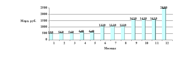 Р В соответствии с изложенными выше правилами на горизонтальной оси размещаются основания двенадцати столбиков на одинаковом расстоянии друг от друга, в данном случае 0,5 см. Ширина столбиков принята 0,5 см. Масштаб на оси ординат – 500 млрд руб. – 1 см. Наглядность данной диаграммы достигается сравнением величины столбиков. Размещение столбиков в поле графика может быть различным: