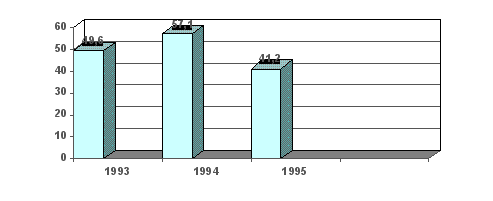 - 40 тыс. фермерских хозяйств Рис. 15. Динамика численности фермерских хозяйств в одном из регионов России за 1993 – 1995 гг. Примем условно за одни знак 40 тыс. фермерских хозяйств. Тогда число хозяйств в России в 1993 г. в размере 49 тыс. будет изображено в количестве 1,22 хозяйства, в 1994 г. – 4,6 хозяйства и т.д. (Рис. 15). Как правило, фигурные диаграммы широко используются для популяризации статистических данных и рекламы.