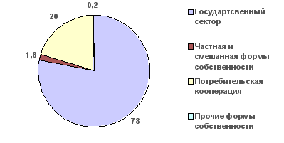 Р Более распространенным способом графического изображения структуры статистических совокупностей является секторная диаграмма, которая считается основной формой диаграммы такого назначения. Это объясняется тем, что идея целого очень хорошо и наглядно выражается кругом, который представляет всю совокупность. Удельный вес каждой части совокупности в секторной диаграмме характеризуется величиной центрального угла (угол между радиусами круга). Сумма всех углов круга, равная 360о, приравнивается к 100%, а следовательно, 1% принимается равным 3,6о. Приведем пример построения секторной диаграммы по данным таб. 10. Таблица 10Динамика доли негосударственного сектора экономики в розничнойторговле ( в % к общему объему розничного товарооборота в России)