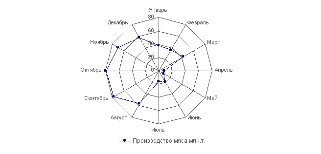 Определив минимальное и максимальное значение логарифмов производства электроэнергии, построим масштаб с таким расчетом, чтобы все данные разместились на графике. Рис. 22. Динамика производства электроэнергии в регионе за 1965 – 1994 гг. Применяя логарифмический масштаб, можно без всяких вычислений характеризовать динамику уровня. Если кривая на логарифмическом масштабе несколько отклонена от прямой и становится вогнутой к оси абсцисс, значит, имеет место прямой – стабильность темпов; если она отклоняется от прямой в сторону, выпуклую к оси абсцисс, изучаемое явление имеет тенденцию к росту с увеличивающимися темпами. Динамику изображают и радиальные диаграммы, строящиеся в полярных координатах. Радиальные диаграммы преследуют цель наглядного изображения определенного ритмического движения во времени. Чаще всего эти диаграммы применяются для иллюстрации сезонных колебаний. Радиальные диаграммы разделяются на замкнутые и спиральные. По технике построения радиальные диаграммы отличаются друг от друга в зависимости от того, что взято в качестве пункта отсчета – центр круга или окружность. Замкнутые диаграммы отражают внутригодичный цикл динамики какого – либо одного года. Спиральные диаграммы показывают внутригодичный цикл динамики за ряд лет. Построение замкнутых диаграмм сводится к следующему: вычерчивается круг, среднемесячный показатель приравнивается к радиусу этого круга. Затем весь круг делится на 12 радиусов, которые на графике приводятся в виде тонких линий. Каждый радиус обозначает месяц, причем расположение месяцев аналогично циферблату часов: январь – в том месте, где на часах 1, февраль – 2, и т.д. На каждом радиусе делается отметка в определенном месте согласно масштабу исходя из данных за соответствующий месяц. Если данные превышают среднемесячный уровень, отметка делается за пределами окружности на продолжении радиуса. В приведенном примере (рис. 23) R = 44,8 тыс.т., длина радиуса – 3,0 см. Следовательно, 1 см = 44,8 : 3,0 15 тыс.т. Данная замкнутая диаграмма наглядно показывает, что производство мяса подвергнуто сезонным колебаниям. Минимум