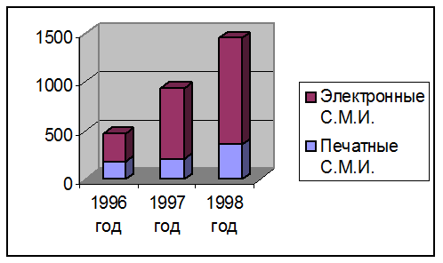 Санкт-Петербургский Гуманитарный Университет Профсоюзов Кафедра государственного права статистическое наблюдение конфликтов и правонарушений связанных с деятельностью средств массовой информации в россии Работа студента Юридического факультетов Третьего курса Первой группы Босова А. С. Григорьева А. С. Научный руководитель профессор Сугак В. П. Санкт-Петербург 2000 Введение Данное статистическое наблюдение посвящено исследованию конфликтов и правонарушений, связанных с деятельностью средств массовой информации в Российской Федерации. Актуальность данной темы объясняется прежде всего тем, что оно в какой то мере отражает развитие средств массовой информации на стадии становления правового государства. Объектом предлагаемого статистического наблюдения являются собственно сами конфликтные ситуации, связанные с функционированием С.М.И. Задачи данного статистического наблюдения непосредственно вытекают из задач статистического исследования вообще и состоят, в частности, в получении массовых данных непосредственно о состоянии изучаемого объекта, в учете состояния явлений, оказывающих влияние на объект, изучении данных о процессе развития явлений. Цели наблюдения определяются прежде всего нуждами информационного обеспечения по данному вопросу для формирования определенной осведомленности общества по вопросу наблюдения, а так же в подведении определенных итогов и выводов на основе полученного статистического материала. В качестве ключевых вопросов статистического наблюдения можно отметить следующие: 1. Общее количество и характеристика конфликтов, связанных с деятельностью С.М.И. за 1996, 1997 и 1998 годы. 2. Природа этих конфликтов а так же характер участия в них средств массовой информации. 3. Степень конфликтности С.М.И. Лидеры конфликтности. 4. География зарегестрированных конфликтов т. е. Распределение числа конфликтных ситуаций по субъектам Российской Федерации. 5. Кто и сколько конфликтует со средствами массовой информации. 6. Нарушения закона, инкриминируемые С.М.И. Общая характеристика конфликтов, Если сравнивать результаты мониторинга за 1998 год со статистикой предыдущих лет, то принципиальных различий в характере нарушений в информационной сфере не обнаружится. Однако это отнюдь не свидетельствует о стабильности ситуации и хотя бы относительном благополучии средств массовой информации. Как показывает проведенный анализ, положение СМИ постоянно меняется и, к сожалению, только в худшую сторону. Забегая вперед, отметим, что положение СМИ в истекшем году заметно ухудшилось не столько за счет прямых нарушений прав прессы и журналистов (хотя и их было немало), сколько за счет необоснованного преследования их по обвинению в мнимых правонарушениях, что будет продемонстрировано в последующем.