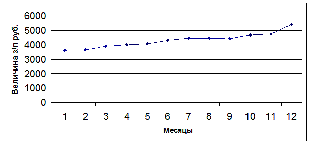 Примерные значения заработной платы составят в: январе 2004 – 5747 рублей 9 копеек феврале 2004 – 5909 рублей 64 копейки марте 2004 – 6072 рубля 18 копеек Вывод: При анализе результатов прогнозирования обоими методами можно с уверенностью сделать вывод о росте значения средней начисленной заработной платы в первые 3 месяца 2004 года. На основании расчётов произведённых разделах 3 и 4 можно сделать ряд выводов: 1. Размер средний начисленной заработной платы и средний размер накопления сбережений во вкладах и ценных бумагах находятся в прямой зависимости, так как при увеличении средних значений одного признака увеличиваются и средние значения другого. 2. Скорость роста (цепной абсолютный прирост) средней начисленной заработной платы равна примерно 162 рубля 55 копеек в месяц. Среднемесячный темп роста составляет примерно 103,7%. 3. Аналитическое выравнивание ряда динамики выполнено, верно, потому что разность между исходными и выровненным уровнем составляет всего 0,0004, и объясняется округлением данных. 4. Значение средней начисленной заработной платы отклоняется от своего среднего значения примерно на 145 рублей или на 3,36%. 5. Совокупность однородна по своему составу, об этом свидетельствует коэффициент вариации, он менее 33%. 6. Так как коэффициент корреляции больше ноля, то есть положительная величина то можно утверждать, что показатели находятся друг с другом в прямой зависимости. Полученная величина коэффициента корреляции равного 0,7494 свидетельствует о возможном наличии достаточнотесной прямой зависимости между рассматриваемыми признаками. Для рассматриваемого примера величина коэффициента детерминации будет равна 0,5616, а это значит, что 56,16% вариации объёма средних накоплений сбережений во вкладах и ценных бумагах, объясняется вариацией средней начисленной заработной платы. Коэффициент корреляции не зависит от случайных обстоятельств. 7. По прогнозам размер заработной латы будет возрастать, он имеет стойкую тенденцию к увеличению. С ростом заработной платы будет происходить и рост объёма сбережений во вкладах и ценных бумагах. При расчётах методом среднегодовых показателей данные получаются несколько выше чем при расчётах методом экстраполяции. В целом по всей работе прослеживается тенденция по увеличению объёмов заработной платы. Но надо принять во внимание один факт. Расчёты в курсовой работе производились по месяцам 2003 года. Этот год был довольно стабильным в финансовом отношении. По этому наблюдался столь большой рост зарплаты. Но Российская экономика характеризуется своей непредсказуемостью. В следствие этого возможно очень существенное отклонение прогнозируемых данных от фактических. Российская экономика вообще трудно поддаётся какому – либо прогнозированию. В качестве предложений можно сделать следующие меры: 1. Повысить размер социальных трансфертов населению (пенсий, пособий, стипендий) для увеличения доходов. 2. Сделать минимальный размер заработной платы равным прожиточному минимуму. 3. Усовершенствовать методику расчёта прожиточного минимума, в соответствии с реальной экономической ситуацией в стране. 4. Повысить среднюю заработную плату работникам бюджетной сферы до среднеобластного уровня. 5. Ввести контроль и государственное регулирование цен на жизненно важные товары и услуги. В результате принятия всех