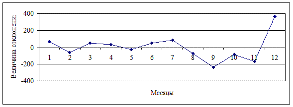 Для наибольшей наглядности полученных данных Отклонение фактических уровней от теоретических представим в виде графика. Рис 2. Отклонение фактических уровней от теоретических По графику видно, что наибольшее отрицательное отклонение в сентябре, а наибольшее положительное декабре. Проверим правильность выравнивания. Если выравнивание выполнено правильно, то должно выполнятся равенство ∑у = ∑ Проверка: 51742 ≈ 51741,9996 Разницу в 0,0004 можно объяснить тем, что округления при расчётах производились до 4 знака после запятой. Для оценки степени приближения выровненных уравнений к фактическим данным рассчитывается остаточное среднее квадратическое отклонение и коэффициент вариации. Формулы представлены в приложении 1.