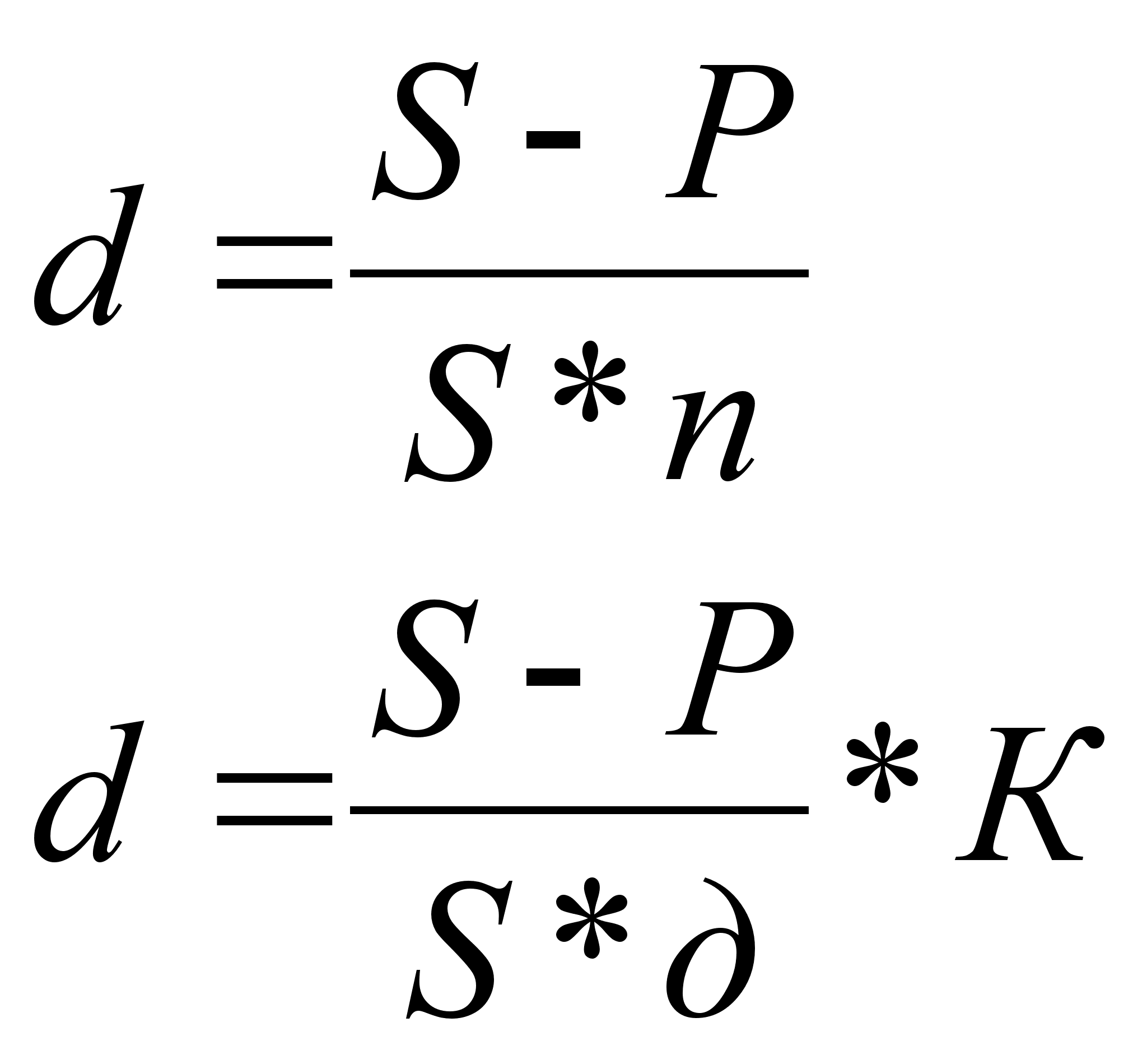 г D - сумма процентных денег S - сумма, которая должна быть возвращена Дисконт (или сумма процентных денег) будет равен: D = d*S Если срок будет больше года, то сумма процентных денег, т.е. дисконт будет равен: D = d*S*n Сумма, которая должна быть возвращена: S = P + I(D) P = S - D(I), где P - наращенная сумма P = S - d*S*n P = S*(1 - d*n), где (1 - d*n) - дисконтный множитель Сумма, выдаваемая заемщику по операции дисконтирования. Пример: ссуда была выдана на полгода по простой учетной ставке 26% годовых. Заемщик должен вернуть в банк 10 тыс. руб. Определить сумму, полученную заемщиком, и величину дисконта. P = 10000*(1 - 0,5*0,26) = 8700 D = d*S*n = 0,26*0,5*10000 = 1300 Ссуда выдается 12 марта 2000 г. по простой учетной ставке 27% годовых. Заемщик должен вернуть 25 декабря 2000 г. 20 тыс. руб. определить сумму, полученную заемщиком, и величину дисконта для различных вариантов временной базы при точном и приближенном числе дней ссуды. дт = 359 - 71 = 288 дп = 240 + 25 + 19 - 1 = 283 nнем = 283/360 = 0,786; nфр = 288/360 = 0,8; nангл = 288/365 = 0,789 Pнем = 20000*(1 - 0,27*0,786) = 15755 Dнем = 20000*0,27*0,786 = 4245 Pфр = 20000*(1 - 0,27*0,8) = 15680 Dфр = 20000*0,27*0,8 = 4320 Pангл = 20000*(1 - 0,27*0,789) = 15750 Dангл = 20000*0,27*0,789 = 4250 Учетная ставка также используется при покупке, учете векселей и других денежных обязательств. В этом случае банк или другое финансовое учреждение до наступления срока платежа по векселю покупает его по цене, меньшей той суммы, которая должна быть выплачена на сумму дисконта, т.е. банк или другое финансовое учреждение реализует дисконт. Формулы по учету векселей и других обязательств применяются аналогичные (выше указанным). Пример: вексель выдан на сумму 20 тыс. руб. со сроком уплаты 30 ноября. Владелец векселя учел его в банке 10 октября по учетной ставке 7% годовых. Определить величину суммы, выданной владельцу векселя, и величину дисконта, если К = 360 дней. дт = 334 - 283 = 51 P = 20000*(1 - 51/360*0,07) = 19801,7 D = S - P = 20000 -19801,7 = 198,3 Операция дисконтирования по учетной ставке процентов может совмещаться с операцией начисления простых процентов. Для суммы, которая будет выплачена при такой операции, используется следующая формула: P = S*(1 - n*d)*(1 - n*i) где (1 - n*d) - дисконтный множитель 1 - n*i) - коэффициент наращения Пример: обязательство уплатить через 150 лет 20 тыс. руб. с процентами (исходя из ставки 5% годовых и К = 365) учтено в банке до наступления срока уплаты по учетной ставке 7% годовых и К = 360. Определить сумму, полученную владельцем обязательства при учете. P = 20000*(1 + 150/365*0,05)*(1 - 40/360*0,07) = 20252 52 Определение срока и учетной ставки. 53 Учет инфляции при использовании учетной ставки. Рассмотрим производные показатели, исходя из основной формулы дисконтирования по учетной ставке: