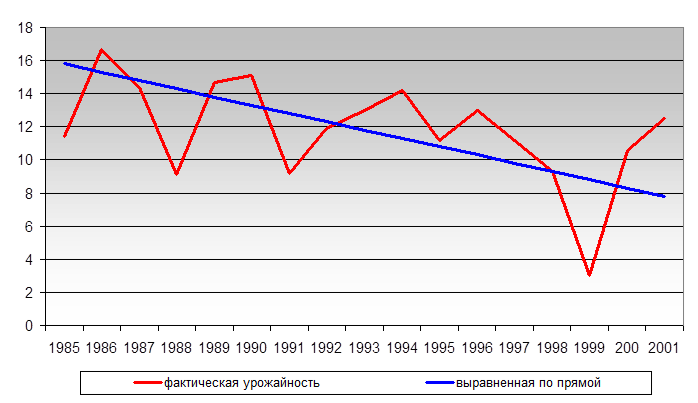 Как видно из таблиц 17 и 18, показатель урожайности с каждым годом уменьшается примерно на 0,5. отсюда можно сделать вывод о тенденции урожайности зерновых к снижению. Приблизительные значения урожайности на перспективу выглядят соответствующим образом (см. таблицу 14). Однако необходимо отметить неточность такого прогноза из-за нечеткой тенденции урожайности, высокой степени ее колеблемости. Поэтому прогнозирование урожайности в данном случае не может быть в достаточной степени достоверным. Тенденция урожайности зерновых.