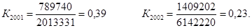 В 2001 г краткосрочные обязательства покрывались краткосрочными вложениями и денежными средствами всего лишь на 31%, в 2002 г. видно увеличение коэффициента, но рекомендуемое значение К>0,7 не выполняется. 3. Коэффициент обеспеченности собственными средствами, который характеризует наличие собственных свободных средств компании, необходимых для ее финансовой устойчивости должен быть не менее 0,1.