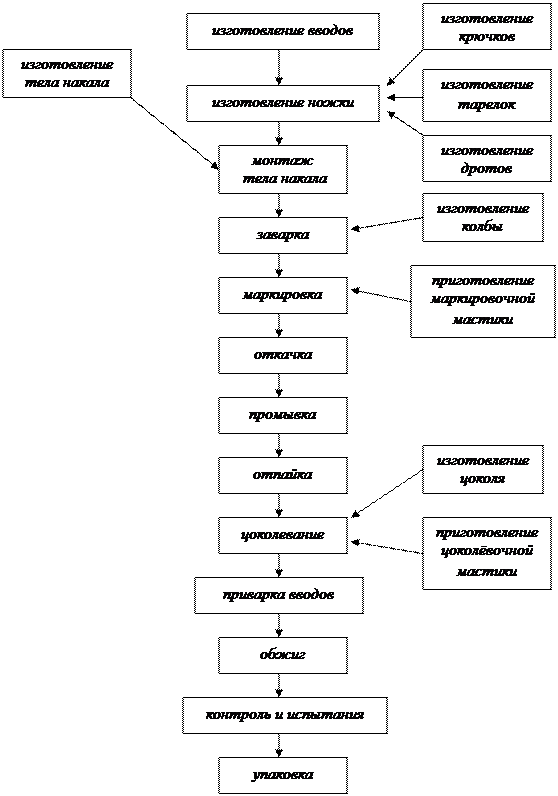 Площадь поверхности F находится по следующей формуле: F = p*dг *h , (2.14) где: dг – диаметр горловины, см; h – ширина зоны заварки, см. Объём колбы рассчитывается по формуле (2.15) Найдём из формул (2.14) и (2.15) объём и площадь: F = 3.14*3.6*0.3; F = 3.39 см2 V = 3.14* 0.3*(3.62 – (3.6 – 0.1)2 )/4; V = 0.167 см3 Массу стекла можно найти по следующей формуле: m = r*V, (2.16) где: r - плотность стекла, г/см3 Масса стекла будет равна: m = 2.5*0.167; m = 0.418 г Подставляя в формулу (2.13) данные, получаем: t = 0.418*0.15*(1000-25)*0.1/0.0019*(1000-900)*3.39; t = 9,49 с. 3. ТЕХНОЛОГИЧЕСК АЯ ЧАСТЬ 3.1 Схема технологического процесса
