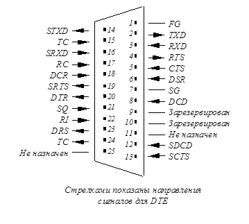 Примечания: 1. Линии 11, 18, 25 обычно считают незаземленными. Приведенная в таблице спецификация относится к спецификациям Bell 113B и 208A. 2. Линии 9 и 10 используются для контроля отрицательного ( MARK ) и положительного ( SPACE ) уровней напряжения. 3. Во избежание путаницы между RD (Read — считывать) и RD (Received Data — принимаемые данные) будут использоваться обозначения RXD и TXD , а не RD и TD . Стандартный последовательный порт RS–232C имеет форму 25–контактного разъема типа D (рис 1).