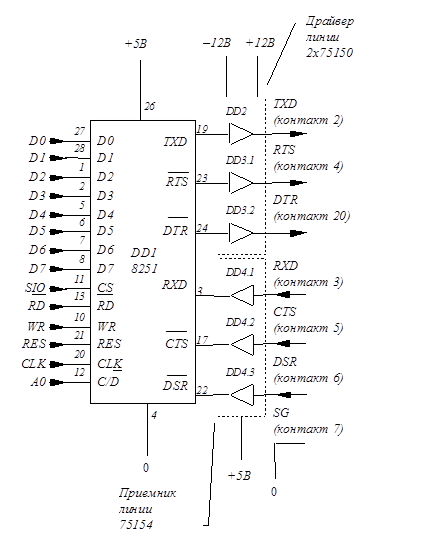 Виды сигналов В большинстве схем, содержащих интерфейс RS–232C, данные передаются асинхронно, т.е. в виде последовательности пакета данных. Каждый пакет содержит один символ кода ASCII, причем информация в пакете достаточна для его декодирования без отдельного сигнала синхронизации. Символы кода ASCII представляются семью битами, например буква А имеет код 1000001. Чтобы передать букву А по интерфейсу RS–232C, необходимо ввести дополнительные биты, обозначающие начало и конец пакета. Кроме того, желательно добавить лишний бит для простого контроля ошибок по паритету (четности). Наиболее широко распространен формат, включающий в себя один стартовый бит, один бит паритета и два стоповых бита. Начало пакета данных всегда отмечает низкий уровень стартового бита. После него следует 7 бит данных символа кода ASCII. Бит четности содержит 1 или 0 так, чтобы общее число единиц в 8–битной группе было нечетным. Последним передаются два стоповых бита, представленных высоким уровнем напряжения. Эквивалентный ТТЛ–сигнал при передаче буквы А показан на рис. 2. Рис. 2. Представление кода буквы А сигнальными уровнями ТТЛ. Таким образом, полное асинхронно передаваемое слово состоит из 11 бит (фактически данные содержат только 7 бит) и записывается в виде 01000001011. Используемые в интерфейсе RS–232C уровни сигналов отличаются от уровней сигналов, действующих в компьютере. Логический 0 ( SPACE ) представляется положительным напряжением в диапазоне от +3 до +25 В, логическая 1 ( MARK ) — отрицательным напряжением в диапазоне от –3 до –25 В. На рис. 3 показан сигнал в том виде, в каком он существует на линиях TXD и RXD интерфейса RS–232C. Рис. 3. Вид кода буквы А на сигнальных линиях TXD и RXD . Сдвиг уровня, т.е. преобразование ТТЛ–уровней в уровни интерфейса RS–232C и наоборот производится специальными микросхемами драйвера линии и приемника линии . На рис. 4 представлен микрокомпьютерный интерфейс RS–232C. Программируемая микросхема DD 1 последовательного ввода осуществляет параллельно–последовательные и последовательно–параллельные преобразования данных. Микросхемы DD 2 и DD 3 производят сдвиг уровней для трех выходных сигналов TXD , RTS , DTR , а микросхема DD 4 — для трех входных сигналов RXD , CTS , DSR . Микросхемы DD 2 и DD 3 требуют напряжения питания ±12 В.