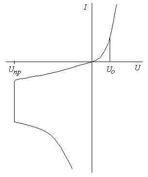 Реальные характеристики сильно отличаются от идеальных. Так, в прямой ветви есть несколько отличий от идеальности, но главное, это то, что экспонента простирается только до напряжения Uп. При U>Uп потенциальный барьер полностью исчезает, и, значит, сопротивление р-п перехода становится равным только сопротивлению п- и р- областям, а сопротивление прослойки исчезает. Поэтому при U>Uп ВАХ линейна, см. рис.