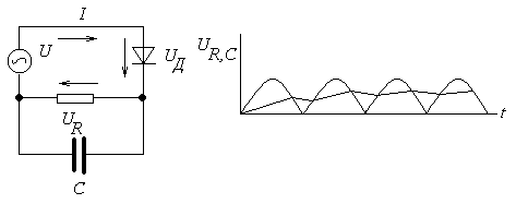 В разных диодах, приготовленных из разных полупроводников, толщина слоя объёмного заряда различная, и поэтому относительная величина этого вклада неодинакова. Обычно в германиевых р-п переходах этот вклад меньше, а в кремниевых р-п переходах больше, и в реальных кремниевых диодах обратный ток практически всегда пропорционален корню квадратному из модуля напряжения (приближённо). Но в обратном направлении есть и ещё некоторые особенности, связанные с тем, что на р-п переходе падает большое напряжение. Поэтому при достижении некоторого напряжения наступает электрический пробой полупроводника. Мы рассмотрим только один из возможных механизмов пробоя – лавинный. В этом случае при достаточно большой напряжённости электрического поля электрон в зоне проводимости, или дырка в валентной зоне могут разогнаться за время между соударениями с какими-то дефектами до энергии, достаточной для рождения новых электрона и дырки. Так вместо одного электрона (дырки) стало три частицы. Каждая из этих частиц тоже можут разогнаться до такой большой скорости и утроиться. Если напряжённость электрического поля увеличивается, то лавинообразный процесс увеличивается – утроение происходит дольше и количество частиц сильно увеличивается. На вольтамперной характеристике это соответствует почти вертикальному участку – напряжение не изменяется, а ток сильно растёт. Дальше наступает тепловой пробой, т.е. получается так, что с ростом тока поднимается температура диода, это приводит к увеличению концентрации за счёт термогенерации, растёт ток, а это приводит к новому росту температуры и так далее, пока образец не сгорит. На этом участке вольтамперная характеристика имеет отрицательный наклон – динамическое сопротивление отрицательно. К другим параметрам р-п перехода относится паразитная ёмкость диода. Она получается из-за того, что в р-п переходе всегда есть область объёмного заряда, то-есть область, в которой всегда есть заряд. Этот заряд зависит от приложенного напряжения, т.е. это и есть обычный конденсатор. Но в отличие от обычного конденсатора р-п переход имеет ёмкость, которая зависит от напряжения. Поэтому удобнее рассматривать не ёмкость, а динамическую ёмкость р-п перехода: Мы рассмотрели реальные свойства полупроводникового диода. А теперь рассмотрим применения диода. Самое простое и очевидное применение р-п перехода – это использование его в качестве выпрямителя. Но здесь важно отметить, зачем делается выпрямление электрического тока. Прежде всего это выпрямление переменного тока для питания различной аппаратуры постоянным током. Это обычно 50 Гц или 60 Гц – довольно низкая частота. Поэтому быстродействие от этих диодов не требуется, но требуется пропускание довольно большого тока, достигается за счёт большой поверхности р-п перехода. Это так называемые силовые диоды. Выпрямление тока происходит по следующей схеме: