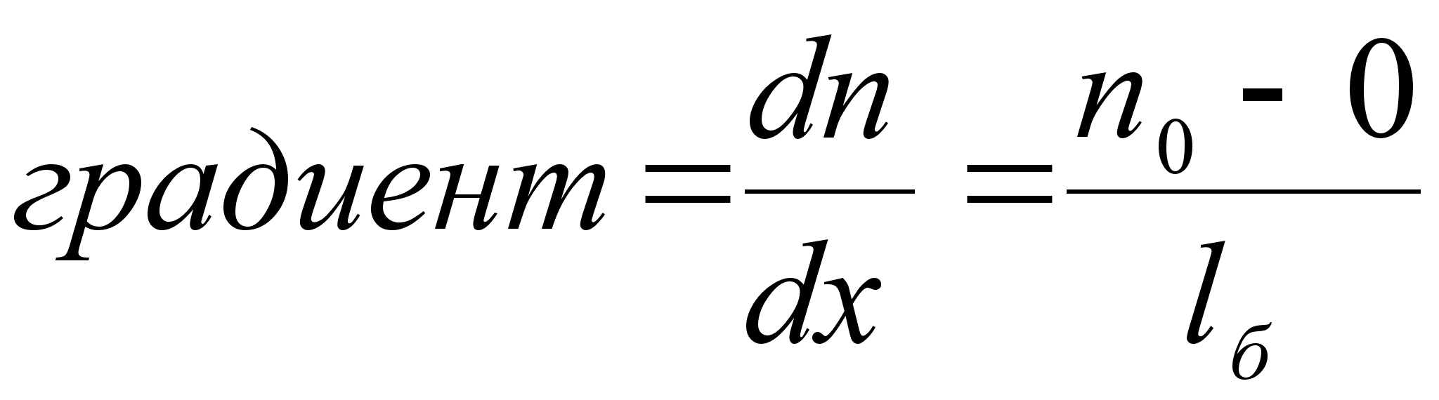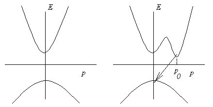 На левом рис. представлена плотность состояний в зависимости от Е. При нулевой энергии она очень мала, точнее равна 2 из-за того, что спин электрона равен +/- Ѕ, т.е. в одном состоянии будет два электрона с разными спинами. С ростом энергии плотность состояний пропорциональна квадрату энергии, отсчитанной от уровня Ec (или Ev –E для валентной зоны). На втором рис. представлена фукция Ферми-Дирака. А на следующем рис. представлено произведение этих двух фукций, которое и представляет собой зависимость конценрации электронов от энергии. Видно, что электронов в зоне проводимости мало, так как вероятность заполнения состояния существенно меньше 1. Значит, они могут двигаться практически как в вакууме, почти что не взаимодействуя друг с другом. Совсем другое можно сказать о валентной зоне: здесь вероятность заполнения состояния практически равна 1, т.е. почти все состояния заполнены электронами. В этом случае трудно описать их движение, так как они практически всегда мешают друг другу, ведь электроны могут куда-то переместиться, только если там свободное состояние, а почти все состояния заполнены. Поэтому договорились описывать состояния пустых мест – "дырок", которых мало (не путать с отверстиями). Они, дырки, могут двигаться как бы независимо, почти не сталкиваясь, и их движение можно тоже описывать довольно просто, так же, как и движение электронов в зоне проводимости. Их концентрация описывается произведением числа состояний на разницу между 1 и функцией Ферми-Дирака, см. третий рис. в валентной зоне. На последнем рис. представлена зависимость энергии от координаты. На дне зоны проводимости есть некоторое количество электронов, у потолка валентной зоны есть некоторое количество дырок. Они, в отличие от электронов, имеют положительный заряд. Так как электроны рождаются при выходе из валентой зоны в зону проводимости электрона, количество их строго равно количеству дырок. Функция Ферми-Дирака описывает равновесное состояние электронов. Если при какой-то температуре (например комнатной) электронов нет, то будет происходить термогенерация электронов и дырок, и постепенно они распределятся по функции Ферми-Дирака. Скорость генерации зависит от температуры и от ширины запрещённой зоны и практически не зависит от концентрации электронов и дырок. Есть также обратный процесс – рекомбинация электронов и дырок: предположим, что при случайном движении электрон встретился с дыркой. Электрон из зоны проводимости попадёт в какое-то состояние в валентной зоне, при этом куда-то выделится разноть энергий и разность импульсов, а электрон и дырки взаимоуничтожатся, аннигилируют, или, как говорят в электронике, рекомбинируют. Скорость этого процесса пропорциональна произведению пр, где п – концентрация электронов (обычно в см-3), и р – концентрация дырок (тоже в см-3). Так как с ростом времени п и р растут при генерации электронов и дырок, этот процесс увеличивает скорость рекомбинации электронов и дырок, и в конце концов она становится равной скорости генерации. Это означает достижение состояния, характеризующегося функций Ферми-Дирака. Таким образом мы видим, что генерация электронов и дырок всегда существует, и всегда существует рекомбинация, просто в равновесии они строго равны друг другу. Концентрация электронов в зоне проводимости определяе