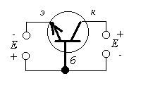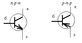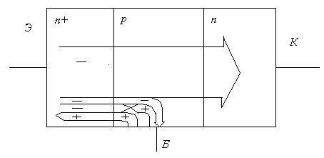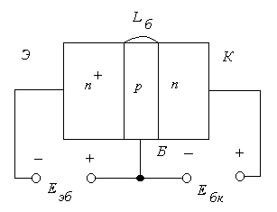 Как показано на рис., это три области – п-, р- и п. (В принципе может быть и наоборот: р-, п-, р-; все рассуждения относительно такого транзистора будут одинаковы, различие только в полярностях напряжений, такой транзистор называется р-п-р, а мы для простоты будем рассматривать п-р-п, изображённый на рис.) Итак, на рис. изображены три слоя: с электронной электропроводностью, причём сильной, что обозначает плюс - эмиттер, дырочной - база, и снова электронной, но более слабо легированной (концентрация электронов самая малая) – коллектор. Толщина базы, т.е. расстояние между двумя р-п переходами, равное Lб , очень мала. Она должна быть меньше диффузионной длины электронов в базе. Это от единиц до десятка мкм. Толщина базы должна быть не более единиц мкм. (Толщина человеческого волоса 20-50 мкм. Отметим также, что это близко к пределу разрешения человеческого глаза, так как мы не можем видеть ничего меньшего, чем длина волны света, т.е. примерно 0,5 мкм). Все остальные размеры транзистора не более примерно 1 мм. К слоям прикладывают внешнее напряжение так, что эмиттерный р-п переход смещён в прямом направлении, и через него протекает большой ток, а коллекторный р-п переход смещён в противоположную сторону, так что через него не должен протекать ток. Однако вследствие того, что р-п переходы расположены близко, они влияют друг на друга, и картина меняется: ток электронов, прошедший из эмиттерного р-п перехода, протекает дальше, доходит до коллекторного р-п перехода и электрическим полем последнего электроны втягиваются в коллектор. В результате у хороших транзисторов практически весь ток коллектора равен току эмиттера. Потери тока очень незначительны: проценты и даже доли процента.