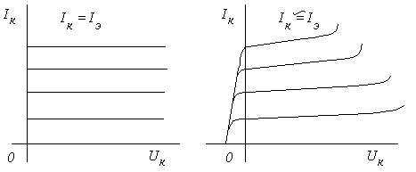 Мы видим, что к эмиттерному р-п переходу приложено прямое смещение: плюс к базовому контакту, а минус к эмиттерному контакту. К коллекторному р-п переходу приложено обратное смещение. В этом случае у хорошего транзистора коллекторный ток лишь незначительно меньше эмиттерного. Значит, вольамперные характеристики должны быть горизонтальными: