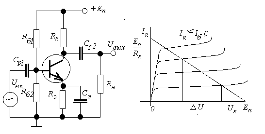 Это левый рисунок. Здесь представлены четыре линии для четырёх токов эмиттера. На самом деле они выглядят немного не так – см. правый рисунок. Во-первых при отрицательном напряжении (а это будет прямое смещение для коллекторного р-п перехода) ток быстро падает. А при положительном напряжении токи коллектора всё-таки немного нарастают, что происходит из-за того, что с ростом напряжения увеличивается обратное смещение на коллекторном р-п переходе, при этом увеличивается его область объёмного заряда, а значит уменьшается нейтральная часть базы. Это и приводит к тому, что полный коллекторный ток постепенно нарастает. В конце наступает резкий рост тока, связанный с пробоем коллекторного р-п перехода. Чаще используется схема с общим эмиттером. В этом случае кривые немного сдвигаются вправо: Если в коллекторную цепи включить резистор, то напряжение будет уменьшаться при больших токах, и может достичь нуля. В этом случае наступит режим насыщения: напряжение на колекторном переходе станет прямым, ток пойдёт из коллектора в базу и из эмиттера в базу, ток в коллекторной цепи прекратится, а в базе начнётся накопление электронов. Это так называемый режим насыщения. Режим насыщения очень неприятен, так как из-за этого накопления носителей в базе резко ухудшается быстродействие транзистора. В схеме с общей базой этого не происходит. Отметим также, что нарастание тока коллектора с ростом напряжения на коллекторе можно охарактеризовать величиной дифференциального сопротиления коллектора: Теперь рассмотрим более подробно три наиболее типичные схемы включения транзистора: с общим эмиттером (ОЭ), с общим коллектором (ОК) и с общей базой (ОБ). Общим называется тот контакт, который либо прямо связан с землёй, либо через низкое сопротивление источника питания. А на остальных контактах будут входной и выходной сигнал. Видно, что схема стала очень сложной. Однако главное, что здесь есть – это резистор Rк , который определяет коэффициент усиления по напряжению, и который составляет от единиц килоом до мегома (чем больше этот резистор, тем больше усиление). Все остальные элементы более или менее условны. Прежде всего Rэ необходимо для термостабилизации транзистора. Это осуществляется за счёт обратной связи по постоянному току, которую мы обсудим позже. Сэ – конденсатор, который шунтирует этот резистор на рабочих частотах, так что при переменном сигнале резистора нет. Этот конденсатор – несколько мкФ. Обычно это электролитический конденсатор. Ср – разделительные конденсаторы, которые отделяют постоянную составляющую сигнала на входе и выходе схемы от внешних сигналлов. Обычно это несколько мкФ. Rб1 – важный резистор, управляющий работой транзистора, служит для задания рабочей точки. Этот резистор задаёт постоянную составляющую тока базы. Его значение зависит от величины Rк . Rб2 – практически ненужный резистор, просто он ставится для предохранения транзистора от сгорания. Его значение должно быть большим, так как стоит он параллельно входу и может его закоротить. Обычно это 1 или несколько килоом, так как входное сопротивление транзистора мало. Rн – сопротивление нагрузки, лучше, если оно большое, так как оно подключено параллельно выходу транзистора, и если оно будет малым, выходной сигнал упадёт. Uвх – сигнал на входе транзистора. Как видно, на 