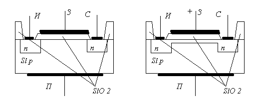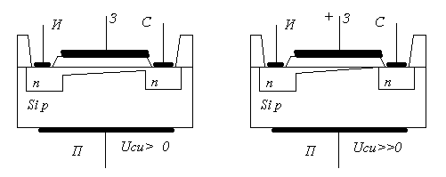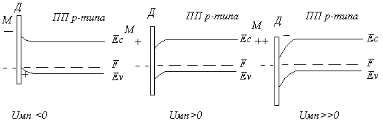 и может достигать нескольких сотен. Кажется, что это существенно более простая схема, но практически она такая же, что и ОИ, но нет конденсатора Си . Поэтому влияние отрицательной обратной связи не исключено, и вследствие этого коэффициент усиления по напряжению практически равен 1, но на самом деле несколько меньше. Коэффициент усиления по току больше 1, и выходное сопротивление существенно меньше, чем у схемы с ОИ. Можно бы построить схему с общим затвором, аналогично схеме с общей базой у биполярных транзисторов. Однако кроме технических сложностей (трудно сделать общий затвор, когда нет тока затвора) нет и такой необходимости, так как входные сопротивления у полевых транзисторов очень велики, и не надо устранять эффект закорачивания выходного сигнала во многокаскадных схемах. Полевые транзисторы МДП Полевые транзисторы металл-диэлектрик-полупроводник (МДП), или по другому металл-оксид-полупроводник (МОП) сильно отличаются от последних рассмотренных как по принципу действия, так и по технологии изготовления. Но конечные данные (переходные и выходные характеристики) у них очень похожи на кривые последних графиков. Рассмотрим, например, полупроводник (кремний, германий) р-типа электропроводности. Будем считать, что на него нанесён тонкий слой диэлектрика (чаще других выращивается оксид кремния на кремнии). Толщина диэлектрика должна быть очень малой. Если в технологии полупроводников используются защитные слои оксида толщиной от 1 до 2...3 мкм, то мы будем считать, что толщина диэлектрика лежит в пределах 0,1...0,3 мкм. А сверху на диэлектрике нанесён слой металла. Между металлом и полупроводником приложено электрическое поле. Н На среднем рисунке изображена диаграмма в случае, когда к металлу относительно полупроводника приложено положительное напряжение, зоны изогнуты вниз. Дырок у поверхности стало меньше, чем в глубине, а электронов – больше. Но пока дырок у поверхности больше, чем электронов. На правом рис. ситуация кардинально изменилась: напряжение снова положительное, но уже достаточно большое, чтобы электронов у поверхности стало больше, чем дырок. Полупроводник разделился на две области: в глубине это по-прежнему р-тип, а вблизи поверхности – п-тип (произошла инверсия типа электропроводности). Теперь рассмотрим конструкцию, изображённую на рис. слева. Это полупроводник (например кремний) р-типа, в котором сделаны две области п-типа. Сверху кроме защитного слоя диоксида кремния нанесён ещё тонкий слой диоксида кремния между п-областями. Если теперь подать напряжение между стоком и истоком, то ничего не произойдёт: ток не появится, так как при любом знаке напряжения хоть один из р-п переходов смещён в обратном направлении (это как в биполярном транзисторе при очень толстой базе – два р-п перехода отдельно). А теперь давайте подадим положительное напряжение на затвор относительно подложки (справа). Если это напряжение больше некоторого, так называемого порогового (Uп ), то дырки оттолкнутся от поверхности вглубь полупроводника, а электроны притянутся к поверхности, и их станет больше, чем дырок – вблизи поверхности появится наведённый (индуцированный) слой п-типа. Этот слой соединит две исходные области п-типа, и между стоком и истоком появится ток. Говорят, что образовался канал п-типа. Конечно, можно взять структуру с р