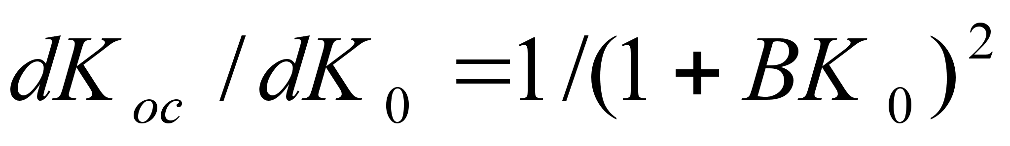 Итак, мы видим, что коэффициент усиления в этом случае совершенно не зависит от исходного коэффициента К0, а определяется некоторой случайной величиной В. Но вот какая особенность. К0 – величина довольно неопределённая. Во первых, она сильно зависит от - коэффициента усиления транзисторов по току, во вторых – сильно зависит от температуры, и вообще довольно нестабильная величина. А В можно сделать специально и довольно точно. Так как В <1, то не требуется усилитель в ООС, то есть можно обойтись, например, резисторами. Итак, В можно сделать заданной с точностью 10-4 ...10-6 , а К0 – с точностью до 100% или хуже. То есть если сделать обратную отрицательною связь специально, то можно улучшить точность задания коэффициента усиления за счёт уменьшения самого усиления (1/В больше, чем единица, но меньше, чем К0 ). Теперь посмотрим более точно, во сколько же раз можно улучшить точность коэффициента усиления. Для этого нужно продифференцировать выражение для Кос по К0 :
