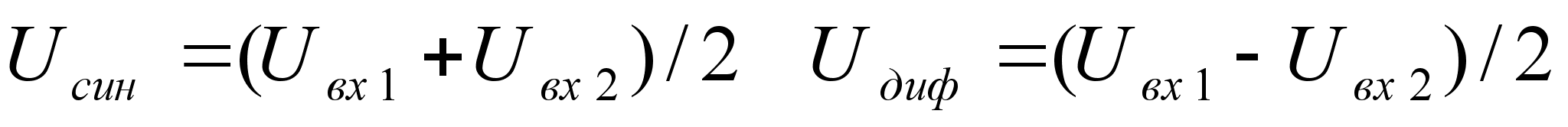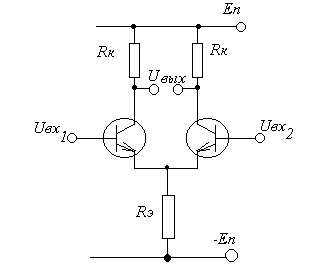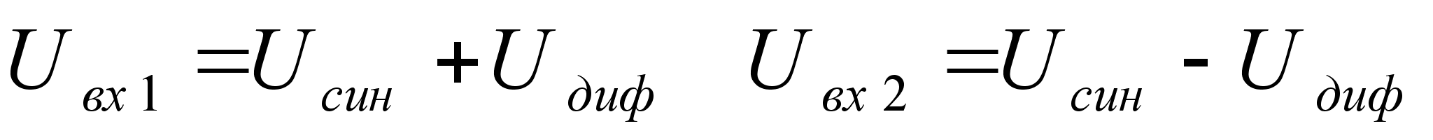 Видно, что германий в 2 раза лучше (термостабильнее), чем кремний. Но в современных условиях кремний гораздо технологичнее (дешевле). Итак, у кремниевых транзисторов приведённый ко входу температурный дрейф составляет всего 2 мВ/0К. Чтобы узнать, что будет на выходе, надо это умножить на перепад температуры и коэффициент усиления. У работающего транзистора перепад температуры вполне может быть 10 0К, а коэффициент усиления у двух- трёхкаскадного усилителя может быть 1000...100000. Получается 20...2000 В. Это очень много. Конечно, можно использовать полевые транзисторы, у них температурный дрейф граздо меньше. Но есть несколько способов борьбы с температурным дрейфом и в биполярных транзисторах. Например, известный способ разделения сигнала на постоянную и переменную составляющие при помощи разделительных конденсаторов. Кроме того, можно преобразовать сигнал в высокочастотный, а после усиления выпрямить (модуляция-усиление-демодуляция). Но наибольшее распространение получил метод дифференциального каскада. Рассмотрим его подробнее. Н Обычно +/- Еп одинаковые. И если Uвх близки к нулю, то на эмиттерном сопротивлении падает большое и почти постоянное напряжение, поэтому ток, протекающий через это сопротивление, тоже почти постоянный. Это значит, что мы задали ток эмиттеров. Далее этот ток разделяется на две части, и протекает через два транзистора. А теперь давайте рассмотрим случай одинаковых входных напряжений – синфазный входной сигнал. Теоретически если на входах синфазный сигнал, то ток, протекающий через транзисторы, будет одинаковый, то-есть разделится пополам. Но этот ток задан резистором и почти не зависит от входного сигнала. Поэтому отклик на синфазный сигнал очень мал, а так как мы на выходе берём разностный сигнал, то он вообще близок к нулю. Это обусловлено тем, что в эмиттере напряжение будет меняться почти также, как и в базах: разность потенциалов между базой и эмиттером меняется гораздо меньше, чем на входах. Дифференциальный сигнал также одинаков на обоих входах, но противоположен по фазе. Поэтому на эмиттерах напряжение почти не меняется, полный эмиттерный ток тоже, а на базах транзисторов напряжение меняется гораздо сильнее, и это приводит к тому, что токи через транзисторы меняются в разные стороны: на одном транзисторе увеличивается, а на другом – уменьшается, хотя в сумме он остался неизменным. Поэтому сигнал на выходе (на коллекторах) будет сильным, да ещё в два раза больше, так как он получается как разность между двумя коллекторами. Дело заключается в том, что для синфазного сигнала схема аналогична схеме с ОК: есть сильная ООС благодаря наличию эмиттерного сопротивления; а для дифференциального сигнала – аналогична схеме с ОЭ: напряжение на эмиттерах практически не меняется, поэтому можно считать, что эмиттеры как бы заземлены. Итак, дифференциальный сигнал хорошо усиливается, как в схеме с ОЭ, а синфазный сигнал сильно ослабляется, как в схеме с ОК во-первых, и за счёт вычитания коллекторных сигналов во-вторых. Если сигналы Uвх1 и Uвх2 произвольные, то можно вычислить синфазную и дифференциальную составляющие по формулам: