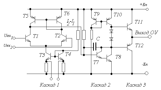 Во втором каскаде у нас 4 транзистора: один сдвоенный транзистор (Т7,Т8) и 2 в качестве активной нагрузки (токовое зеркало, Т9,Т10). Кроме того, здесь используются два диода, а в микроэлектронике вместо диодов, как правило, используются транзисторы. Всего получается 6. Самый простой последний каскад: в нём всего два транзистора Т11 и Т12. Мы уже говорили, что современные ОУ делаются только по технологии микросхемотехники. А в микросхемотехнике очень просто делать транзисторы, несколько сложнее делать диоды и резисторы, ещё более сложно делать конденсаторы и совсем сложно делать индуктивности. Поэтому число транзисторов совершенно несущественно (правда, несколько сложнее делать комплементарные транзисторы). В современных ОУ число транзисторов достигает 50 шт и более. Но при современных возможностях изготавливать микросхемы со степенью интеграции в 106 - это не проблема. Теперь давайте рассмотрим основные характеристики ОУ. К ним относятся 4: