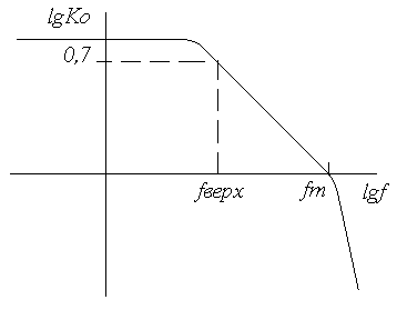 Для одиночного каскада, у которого верхнее и нижнее ограничение по частоте обычно связано с одной RC- цепочкой, нарастание и спад коэффициента усиления связано с частотой пропорционально (рост пропорционален f, спад обратно пропорционален f). В двойном логарифмическом масштабе и то и другое будет идти по прямой, наклонённой под 450 к горизонтали. Другое удобство заключается в том, что двойной логарифмический масштаб полезен при больших изменениях частот и коэффициентов усиления. Ещё нам надо будет искать сигнал, равный 0,7 от Кмакс. Это значит, что нужно отступить вниз от Кмакс на один и тот же шаг вне зависимости от того, чему равен Кмакс. Итак, у нас есть кривая К0, это верхняя кривая на рис., которая описывает частотные свойства усилителя без обратной связи. Надо отступить от максимального значения К0 на уровень 0,7 – этот уровень и определяет нижнюю и верхнуюю частотные границы, а их разность - f0 это полоса частот. Что