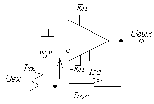 Первое слагаемое – константа, а второе с точностью до постоянного множителя RocI0 является как раз экспонентой. Теперь давайте посмотрим, что получится, если диод поставить в другое место, туда, где стоит сопротивление обратной связи: