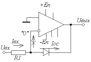 С Это очень важная формула, она говорит, что Кос не зависит от К0 (когда глубина ООС большая), а зависит только от соотношения величин сопротивлений Rос и R1. Такой усилитель называется неинвертирующим. Если Roc=0 , или выходной сигнал подаётся прямо на вход, то Кос=1. Это – повторитель сигнала. Его суть состоит в согласовании входных и выходных сопротивлений. Это последовательная связь по напряжению, значит, входное сопротивление очень велико, а выходное – очень мало. Причина этого заключается в том, что выходное напряжение не может превышать напряжение питания. Если выходное напряжение должно быть больше, усилитель не работает, так он находится "в зашкале". Напряжение питания обычно 10...30 В, а коэффициент усиления 1000...1000000. Другими словами входное напряжение не должно превышать напряжение 30 мкВ ... 30 мВ. Мы можем это считать псевдоземлёй. Теперь давайте рассмотрим протекание тока в точке соединения сопротивлений. Слева втекает входной ток Iвх, справа вытекает ток обратной связи Iос, и ещё возможен ток, протекающий к инвертирующему входу ОУ. Но последний очень мал. Дело в том, что входное сопротивление ОУ обычно высокое, а может быть даже очень высокое, а входное напряжение очень мало. Поэтому этот ток измеряется нано- и даже пикоамперами, и мы можем смело им пренебречь (на рис. этот ток перечёркнут). Итак, есть только два тока: Iвх и Iос. Конечно, они должны быть равны друг другу: