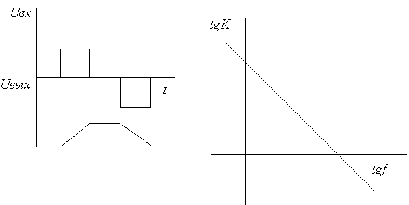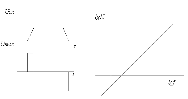 Н На левом рисунке представлены зависимости от времени входного и выходного сигнала. На правом рис. частотная зависимость для дифференцирующего усилителя. Легко понять, что на правом рис. (выше) показан интегратор. Для него графики будут обратными:
