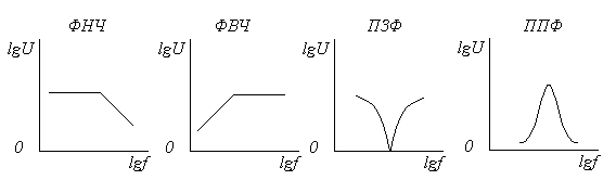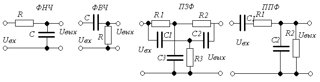 где Qэкв – добротность контура для эквивалентной схемы. Конечно, колебательный контур и сам по себе может осуществлять электрические колебания с частотой fp , но не бесконечно долго. Только транзистор способен усиливать эти колебания. При этом коэффициент усиления может быть большим (достигать 1000), шум в таком каскаде минимален, так как полоса частот очень узкая, температурный дрейф исключён. ОУ в резонансных усилителях не используются. В микроэлектронике делают специальные усилители, к которым можно подключить внешние L и C, или только L. Такие усилители, а также просто транзисторные каскады используются на частотах свыше 10 кГц, так как для более низких частот требуются большие конденсаторы и индуктивности, и это не удобно. Теперь рассмотрим фильтры. Типичные частотные характеристики представлены на рис.: З Первые две схемы – это просто RC цепочки. Эквивалентное сопротивление конденсатора с ростом частоты падает. Поэтому левая схема замыкает все частоты больше чем 1/2RC, а вторая наоборот пропускает все частоты меньше чем 1/(2RC). Эти схемы могут быть и другими. Самое простое усложнение – это применить 2 таких ячейки, 3 и так далее. В основном это приводит к более крутому спаду или росту, и небольшому изменению предельных частот. Но увеличиваются потери из-за неидеальностей элементов. Больше 3 ячеек обычно не используется. На следующем рис. (ПЗФ) показана схема двойного Т-образного моста. Чаще всего используют условие: R1=R2=2R3 и C1=C2=C3/2. При этом на частоте квазирезонанса fp = 1/(2R1C1) выходное напряжение очень мало. Максимальное значение Q=4. Существенно повысить добротность можно, применив вместо резисторов катушки индуктивностей. Далее изображён ППФ – это мост Вина. Если R1=R2 и C1=C2, то резонансная частота определяется по приведенной выше формуле для предыдущей схемы, а максимальное Uвых=Uвх/3. Мост Вина применяется широко, но есть более хорошие схемы.В частности, если резисторы заменить на индуктивности, получается гораздо более узкополосный фильтр с лучшей добротностью. Активные фильтры имеют улучшенные характеристики, так как в них для усиления используется ОУ. Например, на следующем рис. представлена схема с Т-образным мостом и ОУ, включённым по неинвертирующей схеме: