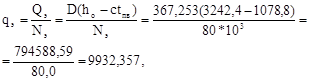 Определяем величину Dm * Him для каждого отбора: DV ( h0 - h5 ) = 0,0988066 в ( 3242,4 - 3138 ) = 10,315409 D; DIV ( h0 - h4 ) = 0,0922986 в ( 3242,4 - 3000 ) = 22,373181 D; DIII ( h0 - h3 ) = 0,03766 в ( 3242,4 - 2864 ) =14,250544 D; DII ( h0 - h2 ) = 0,0658349 в ( 3242,4 - 2682 ) = 36,893878 D; DI ( h0 - h1 ) = 0,059328 в ( 3242,4 - 2471 ) = 45,765619 D Определяем количество энергии, которое вырабатывает поток пара, проходящий через всю турбину в конденсатор: Dк Hi = 0,646072 в * 1043,1 = 673,9177 D. Суммируем полученные выше выражения: S Dm Him = DV (h0 - h5 ) + DIV (h0 - h4 ) + DIII (h0 - h3 ) + DII (h0 - h2 ) + DI (h0 - h1 ) + + Dк Hi = 10,315409D+ 22,373181D + 14,250544D + 36,893878D + 45,765619D + + 673,9177 в = 803,516331D. Таким образом SDm Him = 803,516331D. Тогда SNm = Nэ = К SDm Him , следовательно: 80 МВт = 0,0002711 * 803,516331D = 0,217833 D. Расход пара на турбину: D = 80 / 0,217833 = 367,253 т / ч. Проверку правильности определения расхода пара на турбину сделаем подсчетом “D” по уравнению мощности, т / ч, : D = dэ Nэ + Syт Dэт. Здесь удельный расход пара на выработку электрической энергии: