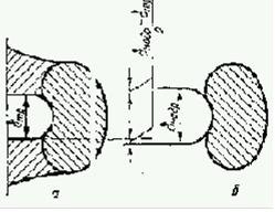 Рис. 6. Схема распространения сопряженных берегов трещины при значениях К=Кmax (a) и К=Кcl (б). Здесь Недостатками рассмотренной модели является ее двухмерность, из-за которой деформационное поведение поверхностных и внутренних (по толщине) слоев образца не может быть идентичным. Поэтому двухмерная модель ЗТШ дает лишь какое-то усредненное вдоль фронта трещины описание процесса закрытия трещины. Еще более существенный недостаток рассматриваемого подхода- полное игнорирование других механизмов закрытия трещины. Впрочем, это относится также и к описанным выше модели жесткого клина, концентрирующие внимание исключительно на ЗТО, а так же ко всем остальным попыткам аналитического описания сложного по физической природе и многообразию реализующегося явления закрытия трещин. Существуют еще два механизма закрытия усталостных трещин, которые реже реализуются на практике, чем описанные выше: закрытие, обусловленное вязкостью рабочей среды, и закрытие, обусловленное объемными изменениями, сопровождающими фазовые превращения материала зоны разрушения. Наличие в трещине вязкой среды препятствует перемещению ее берегов как в полуцикле нагружения, так и при его разгрузке. Поэтому рост усталостной трещины чувствителен к вязкости инертных жидких сред и частоте нагружения. В коррозионной жидкой среде возможно дополнительное повышение ее вязкости во времени за счет растворения образующихся на берегах трещины продуктов коррозии. В этом случае влияние вязкости неоднозначно, ее повышение усиливает потенциальную возможность жидкости создавать внутреннее давление в трещине, хотя и ограничивает проникающую способность. Ситуация, возникающая при росте усталостной трещины в присутствии вязкой среды, может быть смоделирована с учетом раскрытия трещины, плотности и кинематической вязкости жидкости, а также поверхностного натяжения и угла смачивания. Полученные расчетным путем результаты свидетельствуют, что для широкого диапазона вязкостей максимальное значение напряжений, обусловленных внутренним давлением жидкости, не превышают среднего значения цикла приложенных извне напряжений. Поэтому рассматриваемый механизм закрытия трещины влияет на кинематику роста усталостной трещины в меньшей степени, чем ЗТП, ЗТО или ЗТШ. В некоторых случаях закрытие трещины может усиливаться за счет увеличения объема материала в зоне предразрушения вследствие локальных фазовых превращений, вызываемых механическими напряжениями. Этот механизм закрытия трещины во многом аналогичен ЗТП, отличаясь, однако, физической природой процесса образования “лишнего” материала и полости распространяющейся трещины. Таким образом, различаются пять механизмов закрытия трещины усталости (рис. 7). В силу специфической природы реализация двух последних (рис. 7, а, б) возможна лишь в особых условиях: при наличии жидкой среды в вершине трещины или при усталостном разрушении сложнолегированных металлических сплавов, содержащих метастабильные структурные составляющие. В то же время ЗТП, ЗТО и ЗТШ (рис. 7, в-д) более универсальны.
