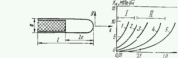 Рис. 3. Расчетная модель жесткого клина для оценки закрытия трещины. Рис. 4. Зависимости коэффициента интенсивности напряжения Kr в момент контакта берегов трещины от толщины клина а и его удаления от вершины трещины 2с: 1 - с=10нм; 2 - с=0.1мкм; 3 - с=1мкм; 4 - с=10мкм; 5 - с=100мкм; I - толщина естественного окисления; II - толщина фреттинг-окисления. Иной вид закрытия, который аналогично рассматриваемому выше ЗТО наиболее характерен для припороговой усталости при пульсирующем и близких к нем циклах напряжений, - закрытие трещин, обусловленное шероховатостью поверхностей разрушения ( ЗТШ ). Считают, что когда высота неровностей рельефа излома соизмерима с величиной раскрытия вершины трещины, а в напряженное состояние материала зоны предразрушения вносит существенный вклад сдвиговая компонента, уровень закрытия может существенно увеличиться путем раслинивания трещины в отдельных контактирующих точках вдоль ее траектории. Существенно усиление закрытие трещины, связанного с шероховатостью вблизи пороговых размахов коэффициента интенсивности напряжения, объясняют следующим образом. Для припорогового роста усталостной трещины, как правило, реализуются условия ry < в , ( где ry - радиус пластической зоны у вершины трещины; в - размер зерна или другого структурного элемента контролирующего процесс разрушения. Согласно представлениям, развитым Б. Томкинсом, для низких размахов коэффициента интенсивности напряжения