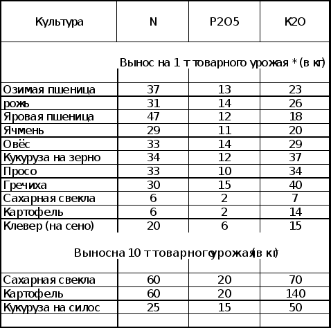 * Вынос приводится на 1 т товарного урожая зерна, сена и на 10т корне-клубнеплодов и силосной массы с соответствующим количеством нетоварной массы (соломы, ботвы и пр.). Данные по выносу могут значительно отклоняться от указанных средних величин. Эффективность удобрений подчиняется закону минимума, а также законам равнозначности и незаменимости факторов жизни растений. Поэтому при научно обоснованной системе питания растений требуется учитывать нуждаемость их во всех питательных веществах и других факторах роста растений. В практике в подавляющем большинстве случаев возникает необходимость внесения трех основных элементов: азота, фосфора и калия. Однако со временем, в особенности на песчаных, торфяных, карбонатных и также переудобренных (зафосфаченных) почвах, может возникнуть необходимость применения микроэлементов. Имеется много методов расчета доз по выносу. Ряд методов основан на учете выноса питательных веществ всем урожаем. Так, часто, особенно для почв с низким плодородием, применяется метод, когда доза удобрений устанавливается из расчета выноса элементов питания планируемым урожаем с учетом коэффициентов использования питательных веществ удобрений для разных условий в пределах: азотных 40—60%, фосфорных 10—25, калийных 40—60%. Существует также способ установления доз, основанный на расчете количества удобрений, необходимого для получения прибавки к урожаю, который можно получить в данных условиях без внесения удобрений. Например, на участке можно вырастить без удобрений урожай озимой пшеницы 20 ц с 1 га. При плане 40 ц с 1 га разницу в урожае надо получить за счет использования удобрений. Для дополнительного урожая потребуется 94 кг азота, 24 кг фосфора и 36 кг калия. С учетом соответственно коэффициентов использования питательных веществ 50, 20 и 50% получим, дозы удобрений, равные 188 кг N, 120 кг P2O5 и 72 кг K2O на 1 га. При планировании доз минеральных удобрений необходимо учитывать и вносимые органические удобрения, рассчитав их действие также по содержанию питательных веществ. В 1 т хорошего навоза в среднем 5 кг азота, 2,5 кг P2O5 и 6 кг K2O В первый год действия навоза из него используется азота 25%, фосфора 40 и калия 60%. При использовании этих методов следует учитывать возможность увеличения доз удобрений для повышения почвенного плодородия. Наиболее правильно определять дозы удобрений несколькими различными методами. Дополняя друг друга, такие расчеты. исключают возможность ошибок. Для достижения высокой эффективности минеральных удобрений они должны быть внесены в рекомендуемые сроки и равномерно распределены по полю. Различают три способа использования удобрений: основное (допосевное), припосевное, подкормка. Основную массу удобрений вносят, как правило, в зону распространения преобладающей массы корней. Поэтому под яровые культуры фосфорные и калийные удобрения вполне могут быть заделаны с осени под вспашку. Однако можно вносить эти удобрения и весной под культивацию, но на достаточно большую глубину. Более подвижные азотные удобрения можно использовать под яровые культуры весной, аммиачные формы и с осени. Под озимые основную массу удобрений вносят под последнюю перед посевом обработку почвы. В качестве припосевного удобрения широко применяют гранулированный суперфосфат, сложные гранулированные удобрения. Внося